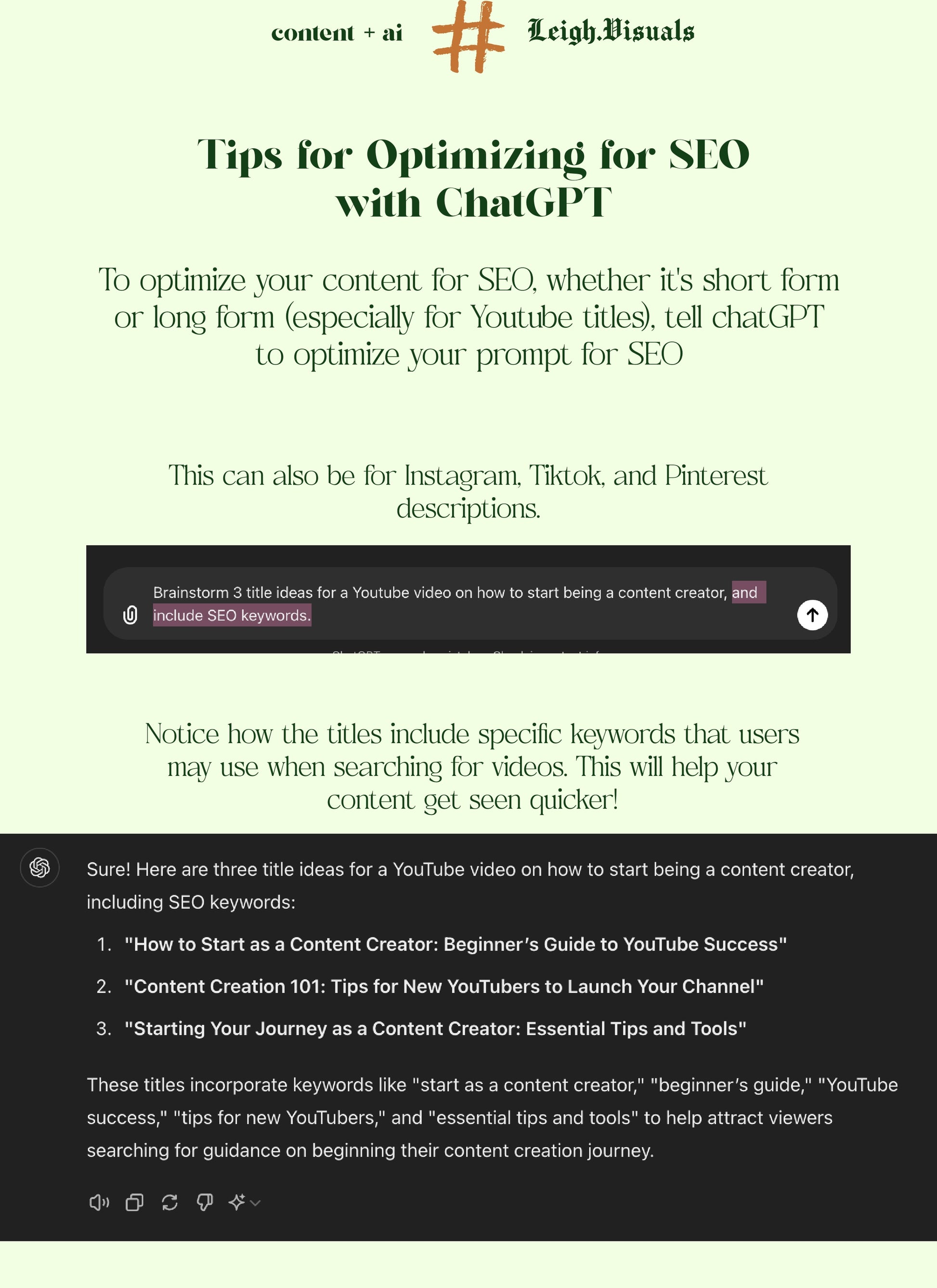 - Optimizing for SEO: Tips on using ChatGPT to enhance your content’s search engine visibility.